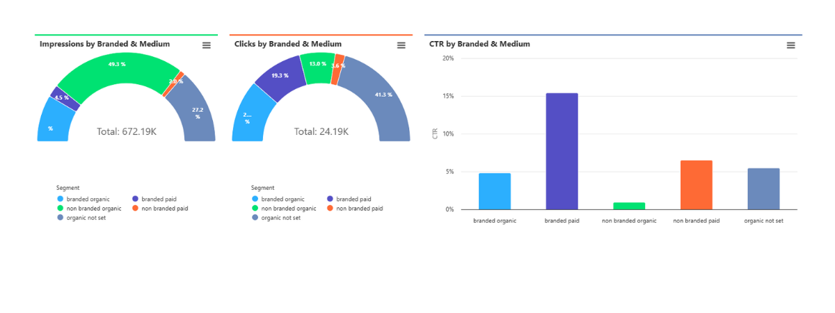 Organic drives most visibility because non branded organic holds 49.3% of impressions out of 672.19K total impressions, while paid is concentrated mostly in branded paid at 27.2% and non branded paid at 2.0%. But clicks follow CTR, not impression share. Out of 24.19K total clicks, branded paid takes 19.3% of clicks because its CTR is the highest in the chart, around 15%, versus ~5% for branded organic. Non branded organic has the weakest CTR, around ~1%, which is typical when rankings are spread across many positions and the SERP is crowded.