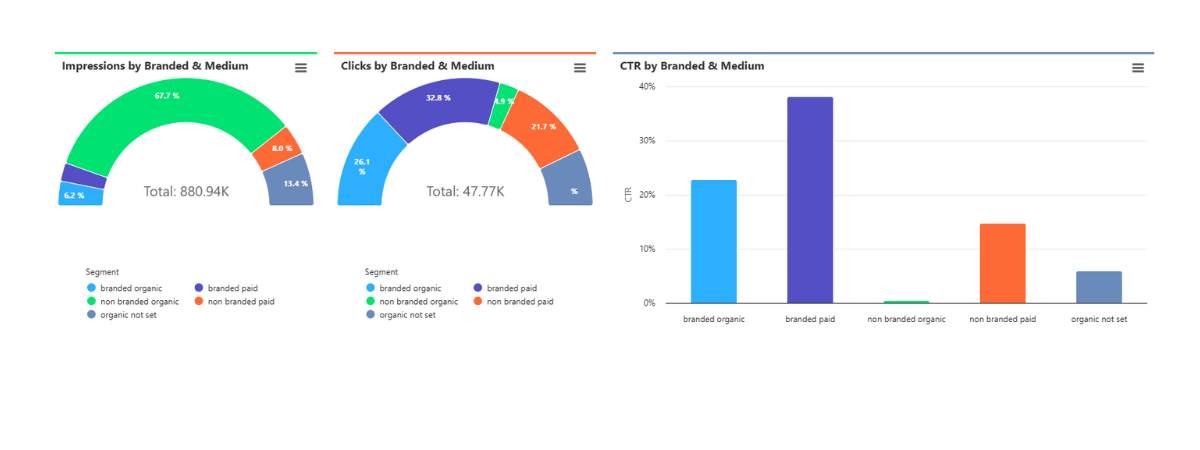 This snapshot is another clean counterexample to the “paid CTR is always low” myth. The CTR chart shows branded paid around the 40% while branded organic sits around 20%. That pattern is consistent with what we see in the distribution as well: non branded organic can generate a lot of impressions, but it does not automatically convert into clicks when the SERP is crowded and rankings are distributed. Meanwhile, paid on branded queries can become the fastest, most obvious click path because it sits above the fold and carries strong ad assets.